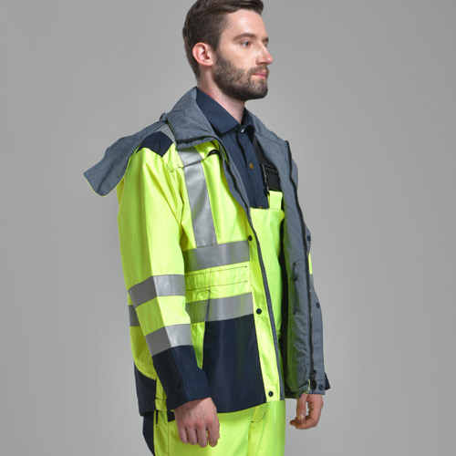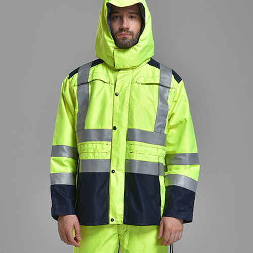 產(chǎn)品采用長(zhǎng)款外套設(shè)計(jì),帶防水雨帽,軀干和雙臂加裝反光帶,提高弱光環(huán)境工作人員的可識(shí)別度。