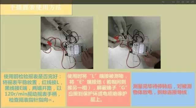 兆歐表有手搖式搖表與電子搖表,并設(shè)有不同的電壓等級:400V及以下選擇500V搖表,1KV-6KV選擇2500V搖表。測絕緣時應(yīng)按設(shè)備電壓等級正確地選擇搖表。在測量之前檢驗被測設(shè)備是否帶電,保證人身安全,若帶電則應(yīng)終止操作,在將帶電設(shè)備斷電隔離后才可進(jìn)行測絕緣操作。400V設(shè)備可用驗電筆或萬用表進(jìn)行驗電。大于或等于1KV的用高壓驗電器進(jìn)行驗電。高壓驗電器分為不同電壓等級,其絕緣桿長度隨電壓等級升高而升高,絕緣特性隨電壓等級升高而升高,因此在選用驗電器時要注意,若所選驗電器絕緣等級不夠會有觸電的危險。