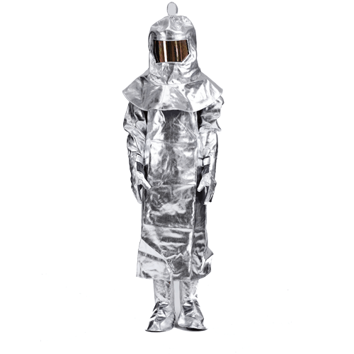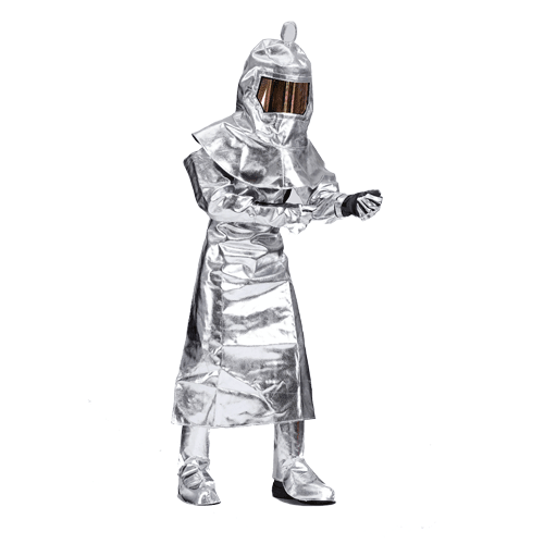 隔熱服采用3層復合玻璃纖維材料,克重500g/㎡最高可耐受EN ISO6942測試輻射熱超過95s,可抵抗1000℃輻射熱,鍍鋁材質與基材不易剝離,質地柔軟,可應用于非直接接觸熱的工業(yè)環(huán)境。通過EN ISO11612-2008防護服-耐熱和防火服裝標準測試方法。